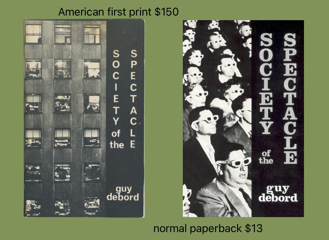 Here’s a Society of the Spectacle first edition in French for $1500. Here’s an American first edition for $150 (this is my fav cover… would be a VERY good gift for a girl like me!!!). Here’s a normal paperback for $13.